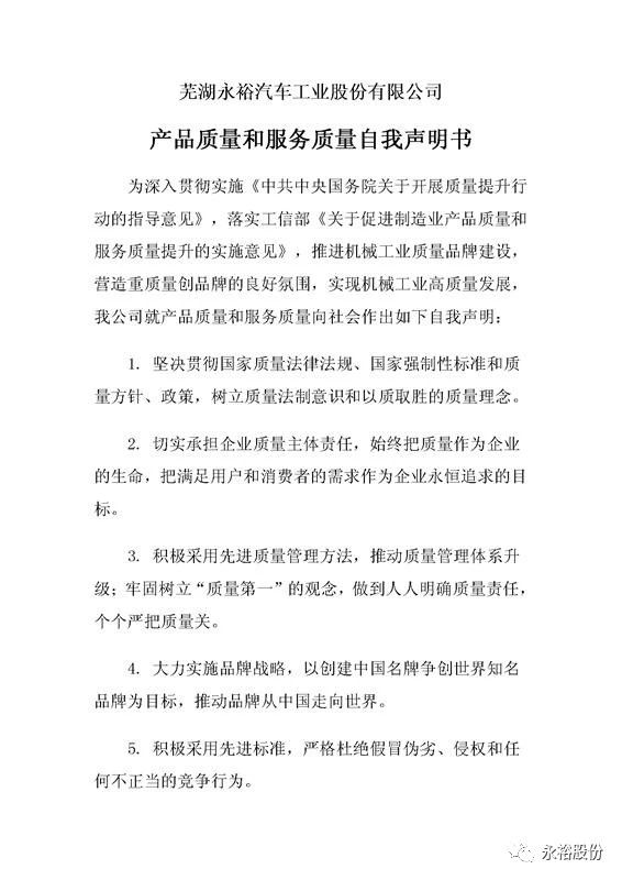 為深入貫徹實(shí)施《中共中央國務(wù)院關(guān)于開展質(zhì)量提升行動(dòng)的指導(dǎo)意見》,落實(shí)工信部《關(guān)于促進(jìn)制造業(yè)產(chǎn)品質(zhì)量和服務(wù)質(zhì)量提升的實(shí)施意見》,推進(jìn)機(jī)械工業(yè)質(zhì)量品牌建設(shè),營造重質(zhì)量創(chuàng)品牌的良好氛圍,實(shí)現(xiàn)機(jī)械工業(yè)高質(zhì)量發(fā)展,我公司就產(chǎn)品質(zhì)量和服務(wù)質(zhì)量向社會(huì)作出自我聲明.